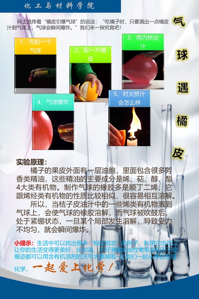 此次化学魅力展采取微信投票结合评委评选的方式进行,围绕化学化工相关知识为主题,以原创海报形式展现化学魅力,同时发布在公司团委微信公众号中进行公开投票,之后由评委综合作品质量及投票结果进行评选。活动期间,公司微信公众号共收到2704人次投票,最终由ladbrokes立博18应化一班董晴的作品《气球遇橘皮》获得了本次展演的一等奖。
