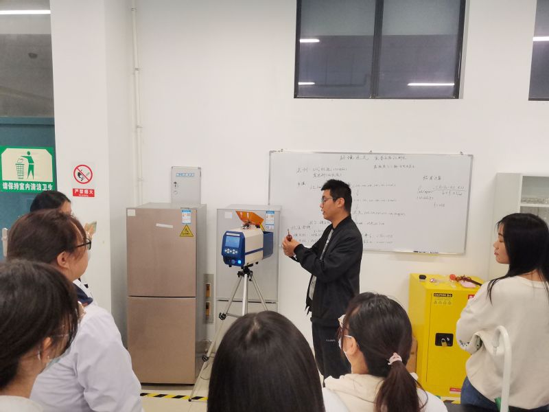本次实践分为3个环节。首先,同学们认真聆听了正远公司技术负责人李慧君对环境污染物的种类、来源和分布等相关环境化学知识的讲解,了解了生活中典型污染物——氮氧化物的分析过程,包括大气样品的采集、显色反应和仪器分析等环节。最后,部分同学通过学习,进行了现场操作,加深了对环境化学知识的理解和技能训练。