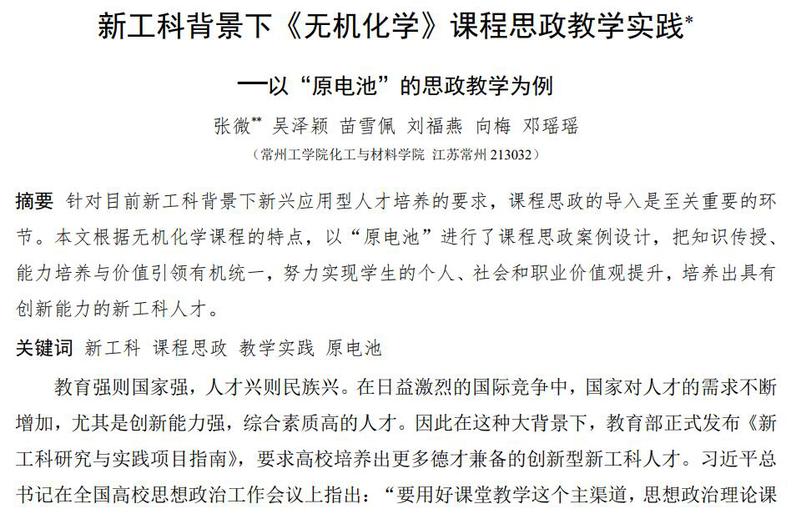 论文报道了无机化学课程中对“原电池”的思政教学的研究。该研究示范了一个无机化学专业课中如何具体的将思政理念贯穿在“原电池”的教学设计和实施的全过程,为应用型本科院校开展以课程思政为理念的课堂教学改革提供了参考,有利于促进全员、全课程、全方位育人的大思政教育体系的构建,实现新工科背景下地方应用型本科院校人才培养目标,为新时代培养创新型、应用型、复合型专业人才。
