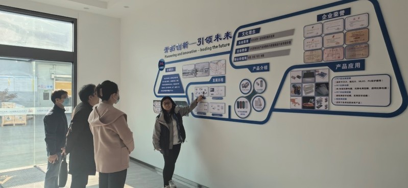 12月5日上午,化工与材料公司党委书记储云峰、经理吴泽颖、复合材料与工程专业负责人薛小强及相关教师,赴江苏华美光电科技有限公司调研。华美公司董事长王上丹及科研部经理陆雁参加交流。
