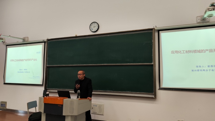 本次讲座由常州都铂高分子有限公司总经理都佩华主讲。都佩华以《应用化工材料领域的产品开发与产业化》为题,从创业项目与产品开发和精细化工产品产业化两方面展开论述,详细讲解了化工与材料类专业员工的从业方向以及毕业后如何在化工行业中提升自我竞争力。他希望同学们要增强自己的专业素养和职业素养,不断开发个人潜能,进一步做好职业生涯规划,实现自己的人生价值。