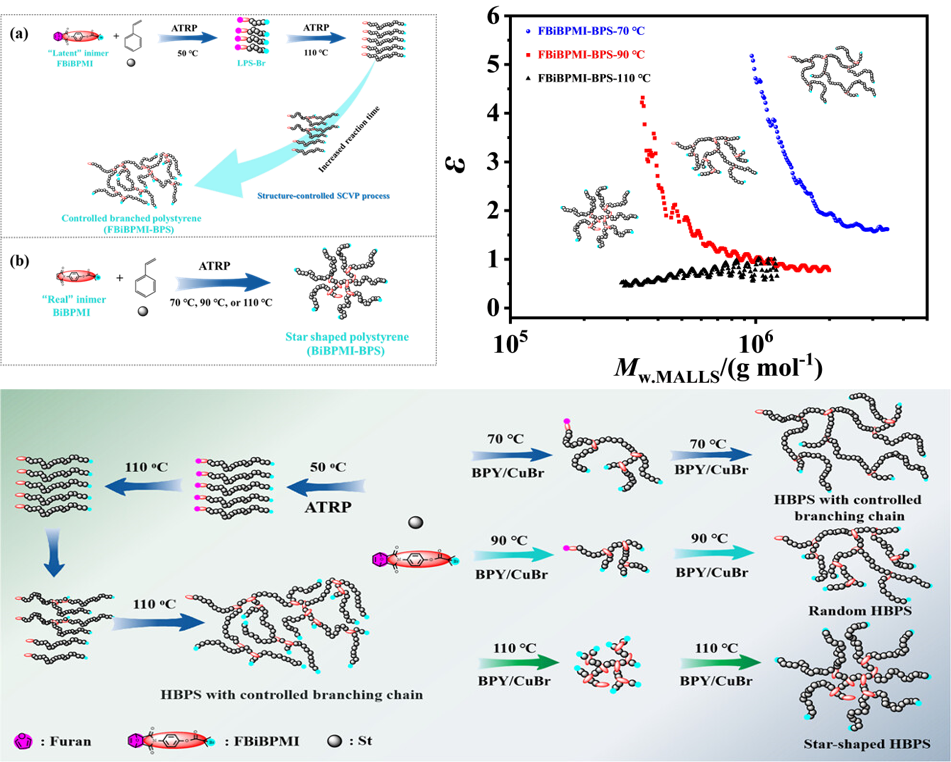 该团队提出了一种通过温度控制合成结构明确的超支化苯乙烯(HBPS)的新方法。该策略组合了自缩合原子转移自由基共聚(ATRP)和Diels-Alder/retro-Diels-Alde反应,并通过一锅法制备结构可控的HBPS。成果的创新理念在于合成了一种“潜伏性”引发剂,由呋喃保护的马来酰亚胺单体和卤代烷烃组成,并通过温度控制,最终成功制备了高度支化和高分子量的HPBS,其支链长度及结构可控。此外,该团队还通过温度刺激成功实现了对聚合物形态的控制,如可控长支链的支链聚苯乙烯、无规支链聚苯乙烯和星形支链聚苯乙烯。