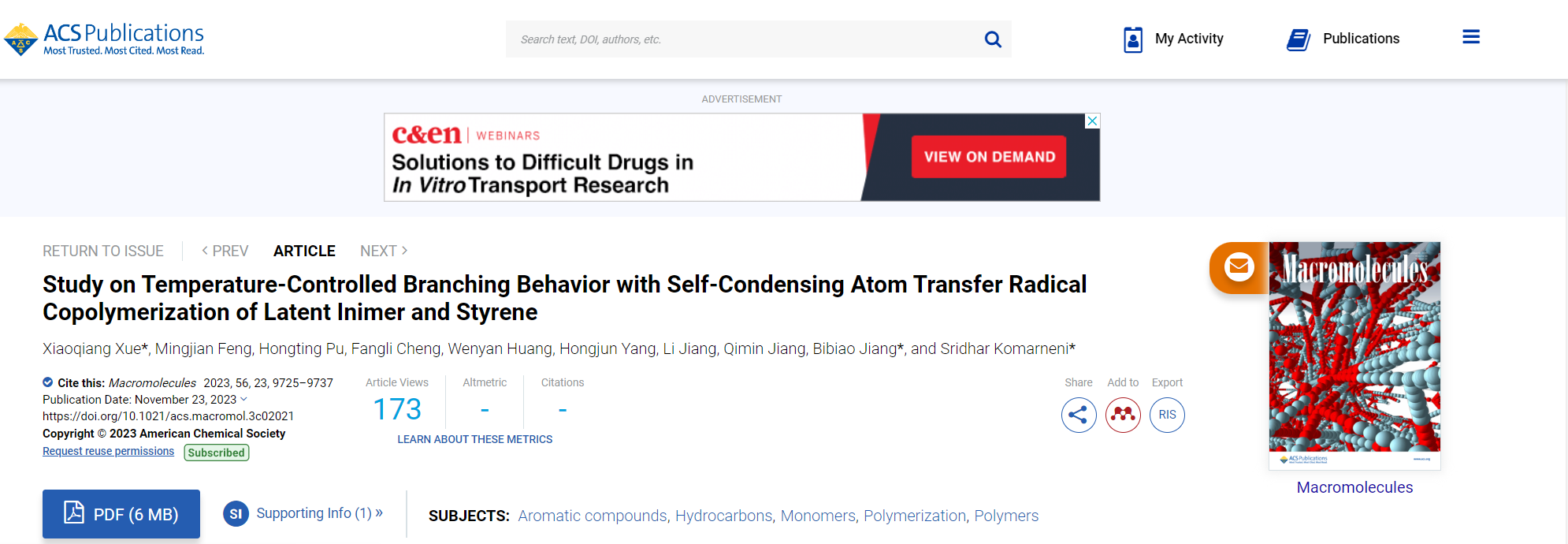 近日,ladbrokes立博/碳纤维新材料产业公司绿色低碳高分子复合材料团队在高分子化学领域取得了重要进展。相关成果以《Study on Temperature-Controlled Branching Behavior with Self-Condensing Atom Transfer Radical Copolymerization of Latent Inimer and Styrene》为题发表在《Macromolecules》上(2023, 56, 23, 9725-9737),公司为第一单位。
